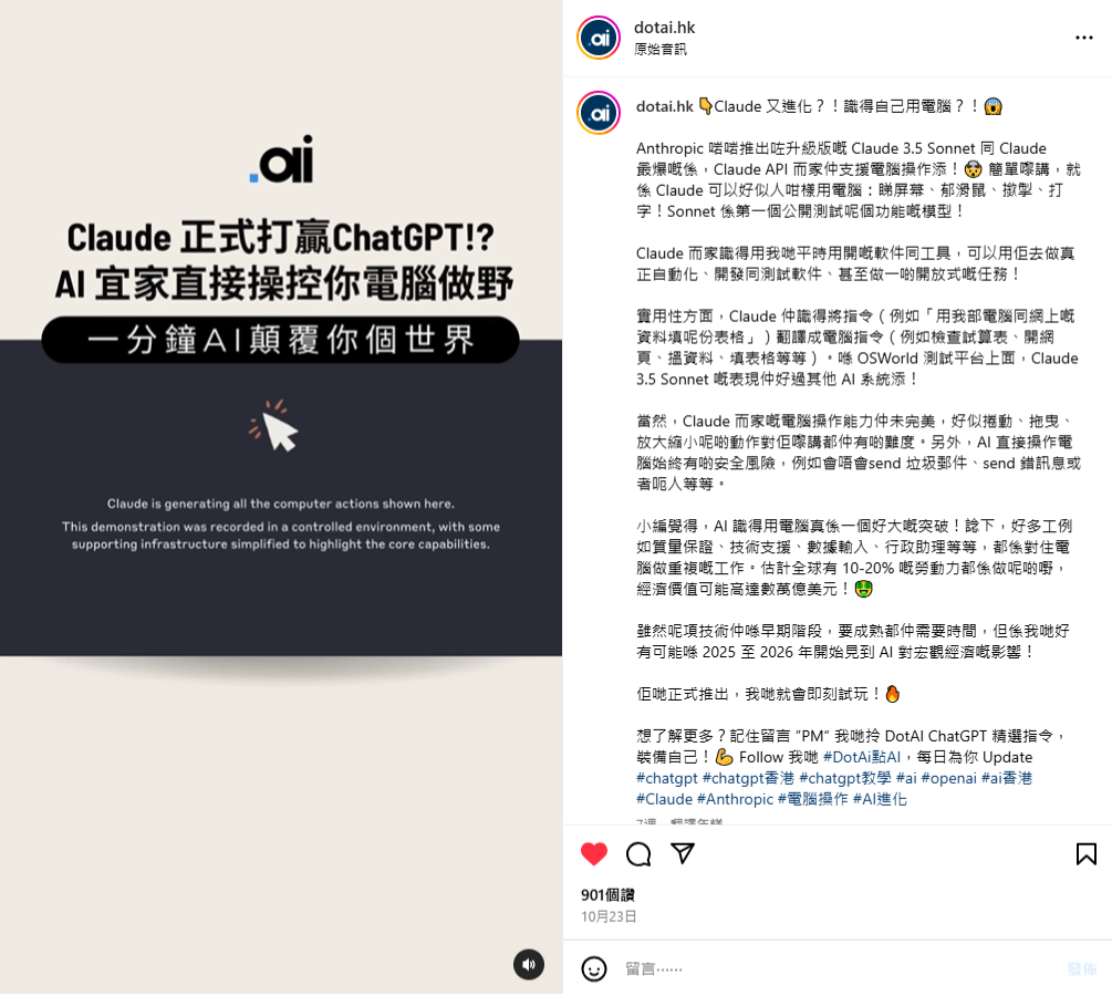 行政總裁楊廣澤與首席營銷官劉泰麟在一年半前一拍即合,共同開創(chuàng)社交媒體賬號,旨在教導觀眾更多實際可靠及接地的AI技巧,幫助打工仔提升工作效率。由于內(nèi)容反應(yīng)熱烈,僅3個月時間,社交媒體的粉絲量就漲到一萬。他們每周規(guī)律地出2至3篇貼文,從搜集資料、撰寫文案、制作圖像,到剪輯影片都用AI。他們現(xiàn)在營運賬號所用到的AI技巧,是可融入企業(yè)營銷的工具,他們也希望把它變成一個商品,或者形成培訓課程,為企業(yè)給員工提供AI培訓。