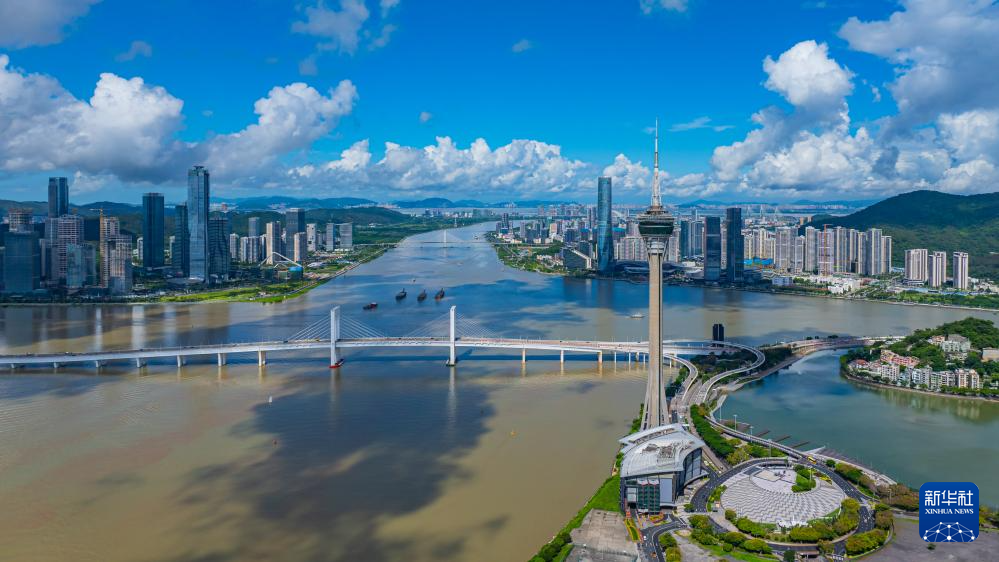 這是7月8日拍攝的澳門半島、橫琴及珠海景色(無人機照片)。新華社
