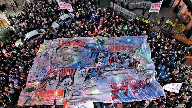 ▲首爾示威者在執(zhí)政國民力量黨總部外舉行“彈劾燭光集會(huì)”,展示諷刺總統(tǒng)尹錫悅的漫畫。