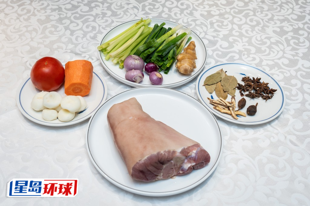 3. 咸豬手加入香料、新鮮蔬菜、佐料及冰糖一起蒸,可令肉味更有層次。