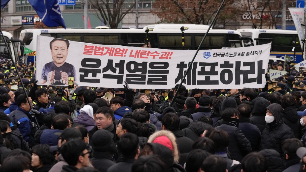 ▲要求彈劾尹錫悅的韓國民眾游行到首爾漢南洞的總統(tǒng)官邸入口。 美聯(lián)社