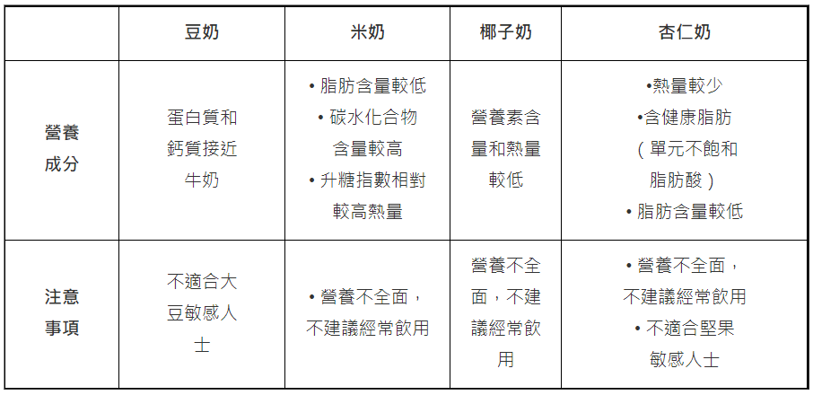 一般來說,對牛奶敏感、患有乳糖不耐癥和素食等人士,都可用植物奶代替牛奶。由于部分植物奶的熱量較低,亦適合減肥人士飲用。然而,對于需要均衡營養(yǎng)的人士,如正在發(fā)育的幼童、營養(yǎng)不良者和胃口不佳者,以植物奶完全取代牛奶則未必適合。