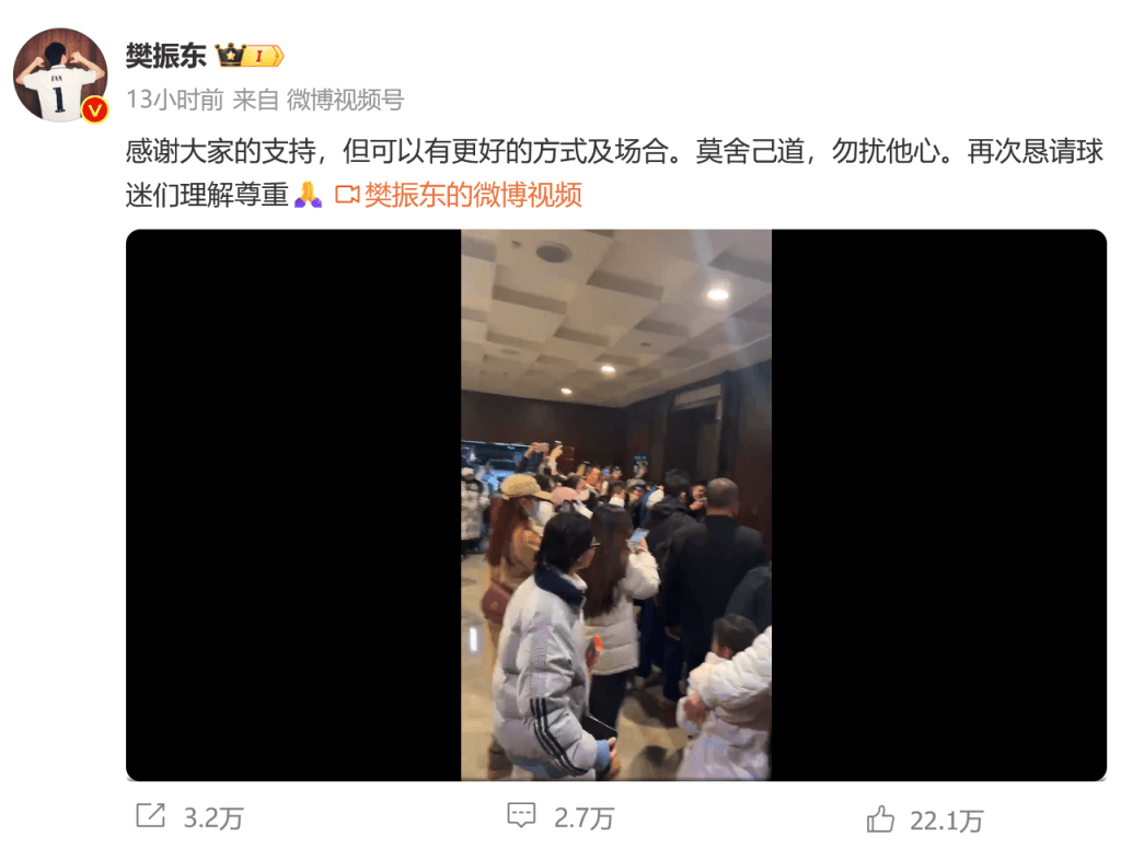 樊振東發(fā)貼,不滿粉絲在酒店圍堵。