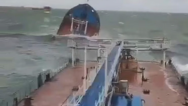 社交平臺流出的影片顯示,一艘油輪已經(jīng)船頭向上,可能已經(jīng)斷開而沉沒。