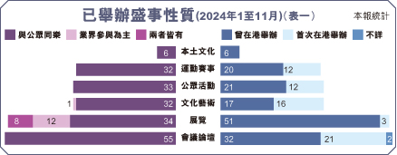 另一方面,147項(xiàng)盛事(69%)曾在港舉辦,約3分1(51項(xiàng))為展覽,其中貿(mào)發(fā)局舉辦的展覽占33項(xiàng),首次在港舉辦有64項(xiàng)活動(dòng),會(huì)議論壇約占三分之一(21項(xiàng))為最多、運(yùn)動(dòng)賽事及公眾活動(dòng)各占12項(xiàng)。