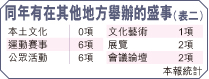 此外,17項(xiàng)已完結(jié)盛事今年有在其他地區(qū)舉辦,其中6項(xiàng)為運(yùn)動(dòng)盛事,多為世界級(jí)賽事的分站,6項(xiàng)公眾活動(dòng)如“S2O亞洲潑水音樂(lè)節(jié)”、“Waterbomb音樂(lè)節(jié)”等,多從外地引入,另有零星文化藝術(shù)、會(huì)議論壇及展覽項(xiàng)目,僅本土文化活動(dòng)為100%本地舉辦。