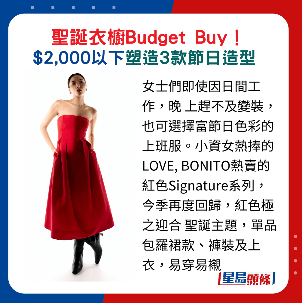 女士們即使因日間工作,晚上趕不及變裝,也可選擇富節(jié)日色彩的上班服。 小資女熱捧的LOVE, BONITO熱賣(mài)的紅色Signature系列,今季再度回歸,紅色極之迎合 圣誕主題,單品包羅裙款、褲裝及上衣,易穿易襯