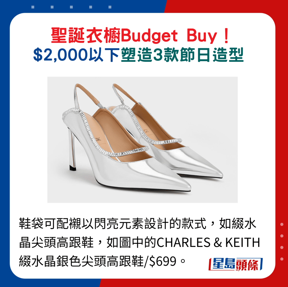 鞋袋可配襯以閃亮元素設(shè)計(jì)的款式,如綴水晶尖頭高跟鞋,如圖中的CHARLES & KEITH綴水晶銀色尖頭高跟鞋。