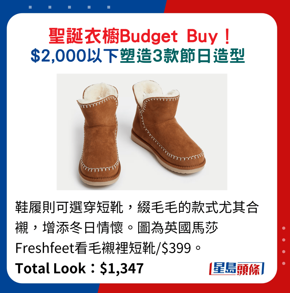鞋履則可選穿短靴,綴毛毛的款式尤其合襯,增添冬日情懷。 圖為英國(guó)馬莎Freshfeet看毛襯里短靴。 Total Look:$1,347