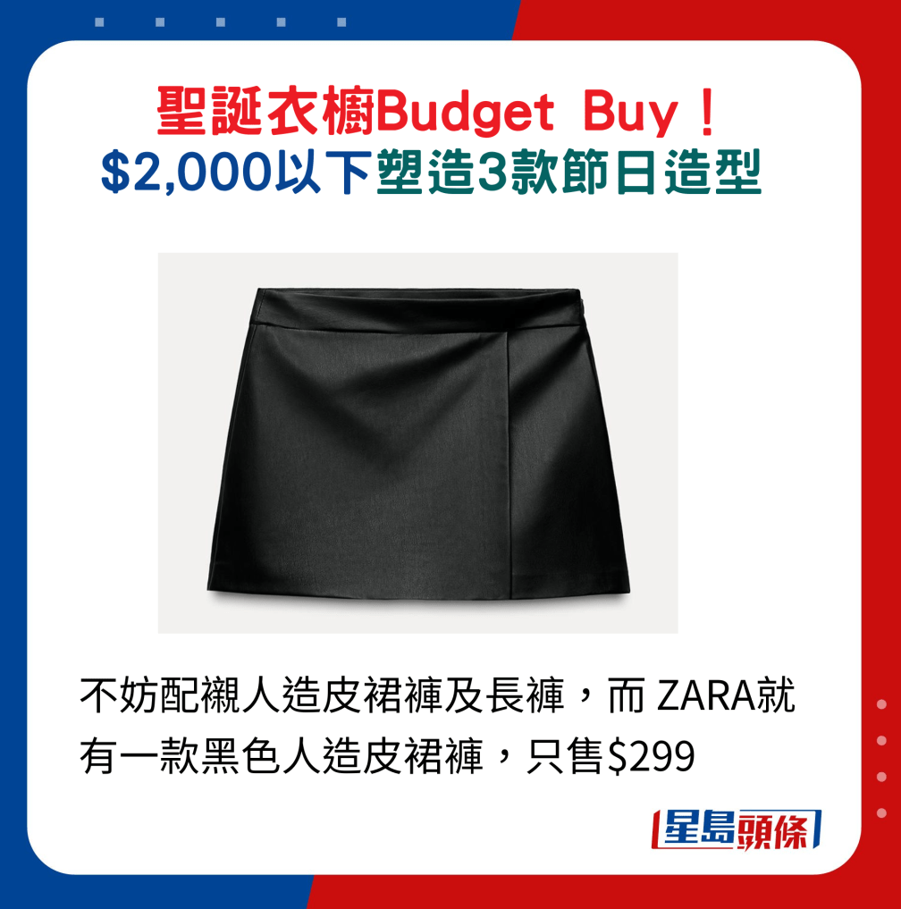不妨配襯人造皮裙褲及長(zhǎng)褲,而 ZARA就有一款黑色人造皮裙褲,只售$299