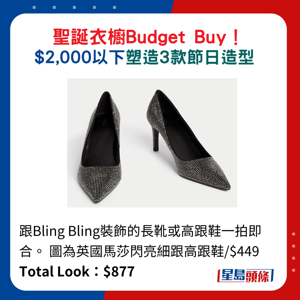 跟Bling Bling裝飾的長(zhǎng)靴或高跟鞋一拍即合。 圖為英國(guó)馬莎閃亮細(xì)跟高跟鞋 Total Look:$877