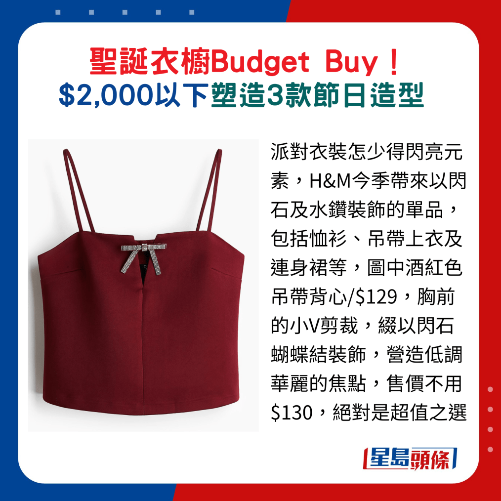 派對(duì)衣裝怎少得閃亮元素,H&M今季帶來(lái)以閃石及水鉆裝飾的單品,包括恤衫、吊帶上衣及連身裙等,圖中酒紅色吊帶背心,胸前的小V剪裁,綴以閃石蝴蝶結(jié)裝飾,營(yíng)造低調(diào)華麗的焦點(diǎn),售價(jià)不用$130,絕對(duì)是超值之選