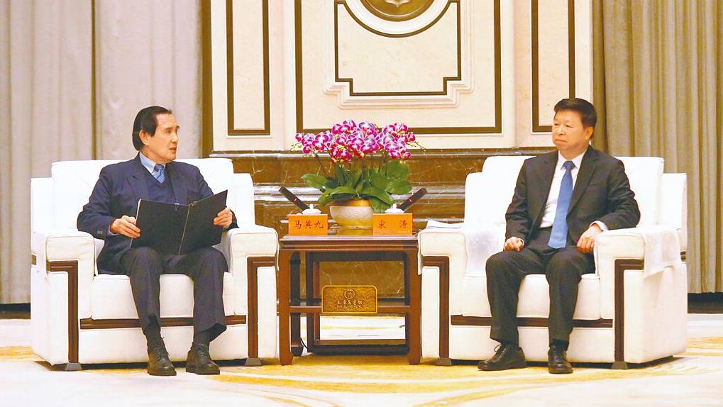 ▲馬英九(左)18日率臺青赴哈爾濱參加“海峽兩岸青年冰雪節(jié)”,晚間與國臺辦主任宋濤(右)會面。 中時