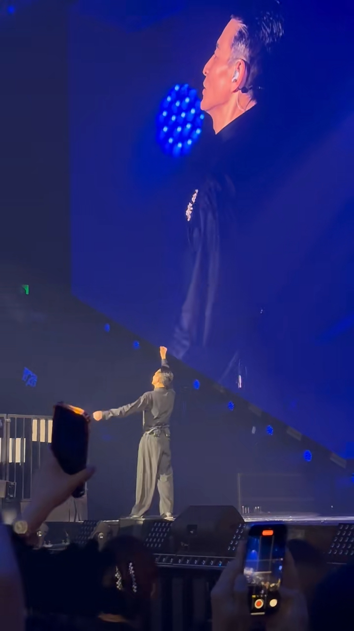 ▲劉德華身穿黑色襯衫及同色西裝馬甲背心,正在臺(tái)上感情充沛地演唱金曲《17歲》,不時(shí)走向臺(tái)邊與臺(tái)下歌迷揮手互動(dòng)。
