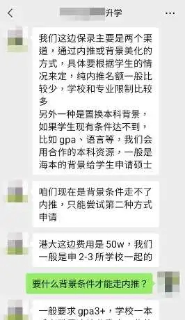 當被問及如何保證獲得錄取時,中介解釋是通過“內(nèi)推”渠道,即通過中介機構(gòu)可獲得大學教授的內(nèi)部推薦信。雖然名額有限,且要求具備一定學業(yè)水平,但入學門檻遠低于常規(guī)申請。中介強調(diào):“只要雅思英語測試(IELTS)能夠考獲5.5分,無需考慮內(nèi)地高考成績也能夠通過‘內(nèi)推’入讀港三大(港大、中大、科大)?!?/p>