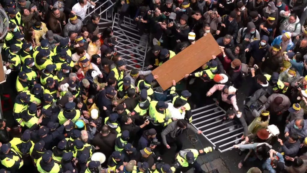 ▲“立法院”外青鳥(niǎo)群眾沖破圍欄,與駐衛(wèi)警爆發(fā)沖突。(截自中時(shí)新聞網(wǎng)直播)