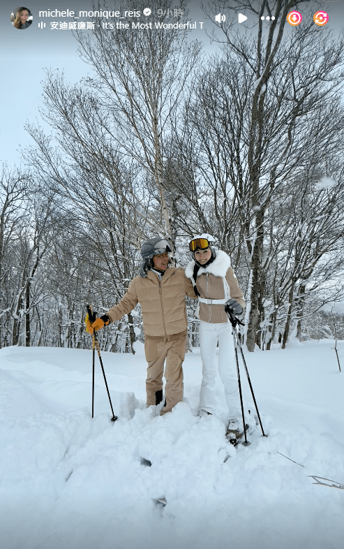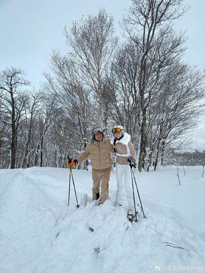 李嘉欣昨日(19日)在微博貼出滑雪靚相曬恩愛。