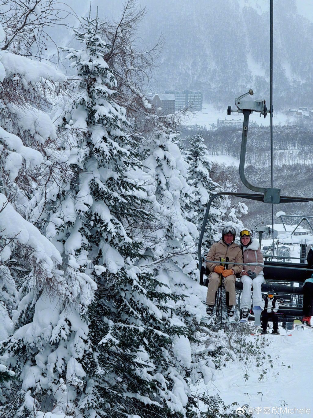 ▲李嘉欣與許晉亨登上滑雪場纜車時,肩并肩影相,兩人的笑容充滿甜蜜幸福。