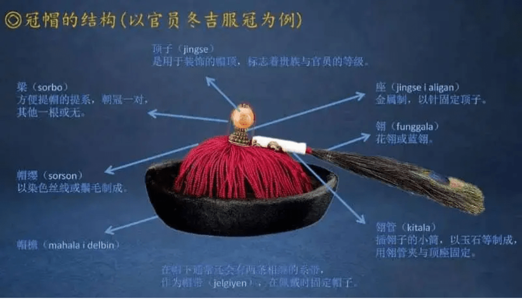 清代冠帽上的羽翎主要是花翎和藍(lán)翎兩種,以花翎為尊?;峋褪强兹肝膊繋в小澳繒灐钡挠痿?,“目暈”又被稱為“眼”,指的是孔雀尾毛上的彩色圓斑。花翎的目暈越多表示身份地位越尊貴,一般是高級(jí)官員戴用。藍(lán)翎又稱為“老鴰翎”或“雕翎”,藍(lán)色,羽毛較長(zhǎng)但沒(méi)有目暈,與花翎相比等級(jí)較低,一般是中下級(jí)官員戴用。