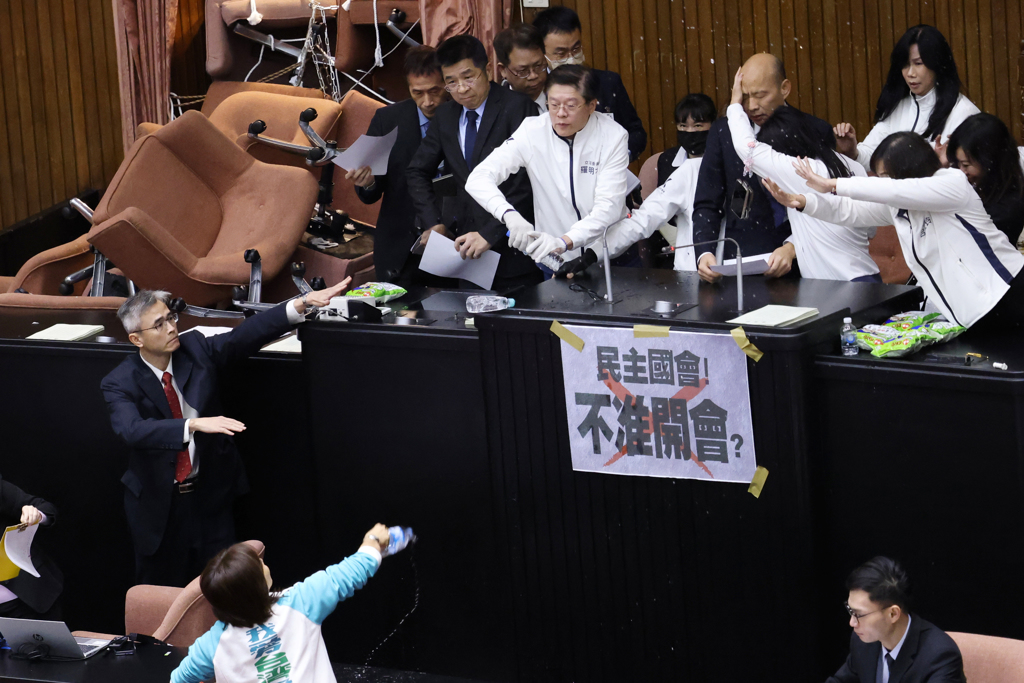 ▲“立法院”會20日排審選罷法等案,“立法院長”韓國瑜(上排中)在主席臺上遭到民進黨“立委”邱議瑩(左下)潑水。 中時資料照