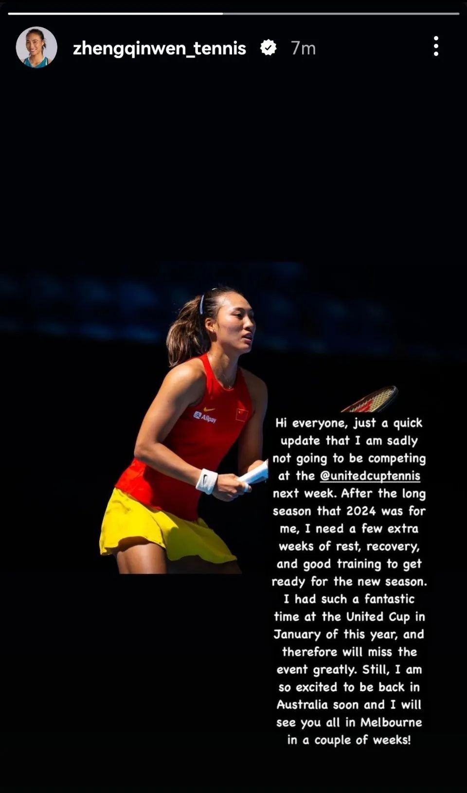 ▲鄭欽文在公告中稱,“經(jīng)歷了漫長的2024賽季之后,我需要多幾周的時(shí)間來休息和恢復(fù),好好訓(xùn)練為新賽季做準(zhǔn)備。”她同時(shí)表示,今年1月在聯(lián)合杯度過了美好的時(shí)光,因此會(huì)非常想念這項(xiàng)賽事。 圖片來源:WTA社交媒體