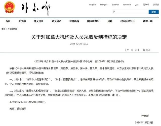 依據(jù)《中華人民共和國反外國制裁法》第三條、第四條、第五條、第六條、第九條、第十五條規(guī)定,中方?jīng)Q定對以下加拿大機構及人員(詳見后附反制清單)采取反制措施: