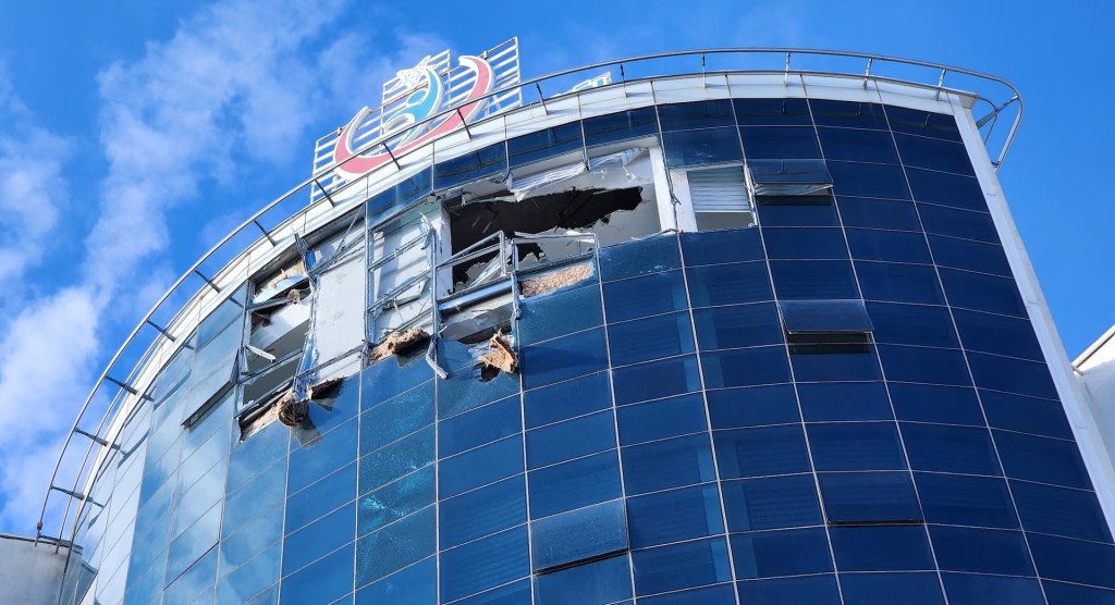 ▲醫(yī)院玻璃外墻被撞毀。路透社