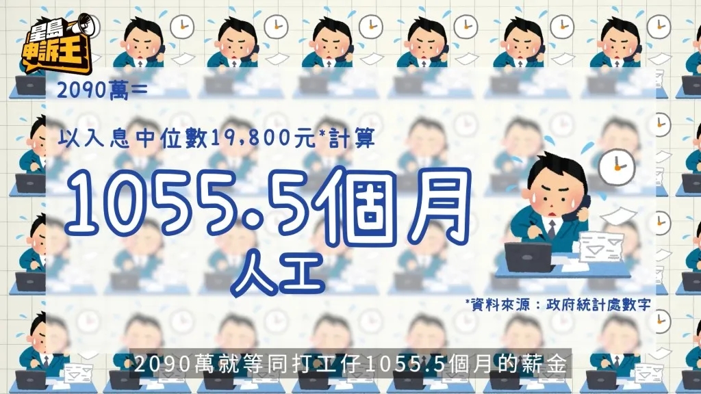 按港府統(tǒng)計處最新一季調(diào)查顯示,港人入息中位數(shù)平均為19800元,2090萬即等同打工仔約1055.5個月的薪金。星島記者訪問了多位市民,大部份受訪市民均認為2090萬是天文數(shù)字,一般打工仔或單靠工作薪金儲得,甚至有人笑言“只有富二代才能做到”,亦有人表示需要靠投資、買樓或買股票等輔助才能在退休時儲到2090萬。