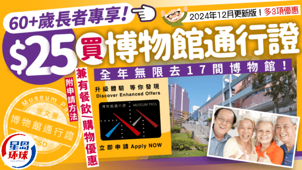 康文署的博物館通行證分為家庭、個(gè)人、優(yōu)惠3款,優(yōu)惠就包括全日制全日制學(xué)生、殘疾人士、60歲或以上的長(zhǎng)者。 長(zhǎng)者只需以每年$25的優(yōu)惠價(jià),便可購(gòu)買這張博物館通行證,由簽發(fā)日期起12個(gè)月的有效期內(nèi),可無(wú)限次參觀康文署轄下博物館的常設(shè)及專題展覽(特定專題展覽除外),并可于博物館內(nèi)的禮品店、書店、指定餐、參加特備活動(dòng)中享用優(yōu)惠,以及購(gòu)買香港迪士尼樂園“奇妙處處通”會(huì)籍及香港海洋公園全年會(huì)籍享都享有優(yōu)惠,多達(dá)7大項(xiàng)。 最近,購(gòu)買香港海洋公園全年會(huì)籍的優(yōu)惠期更延長(zhǎng)至2026年8月31日,以及增設(shè)了購(gòu)買香港舞蹈團(tuán)及古魏博物館門票的優(yōu)惠!
