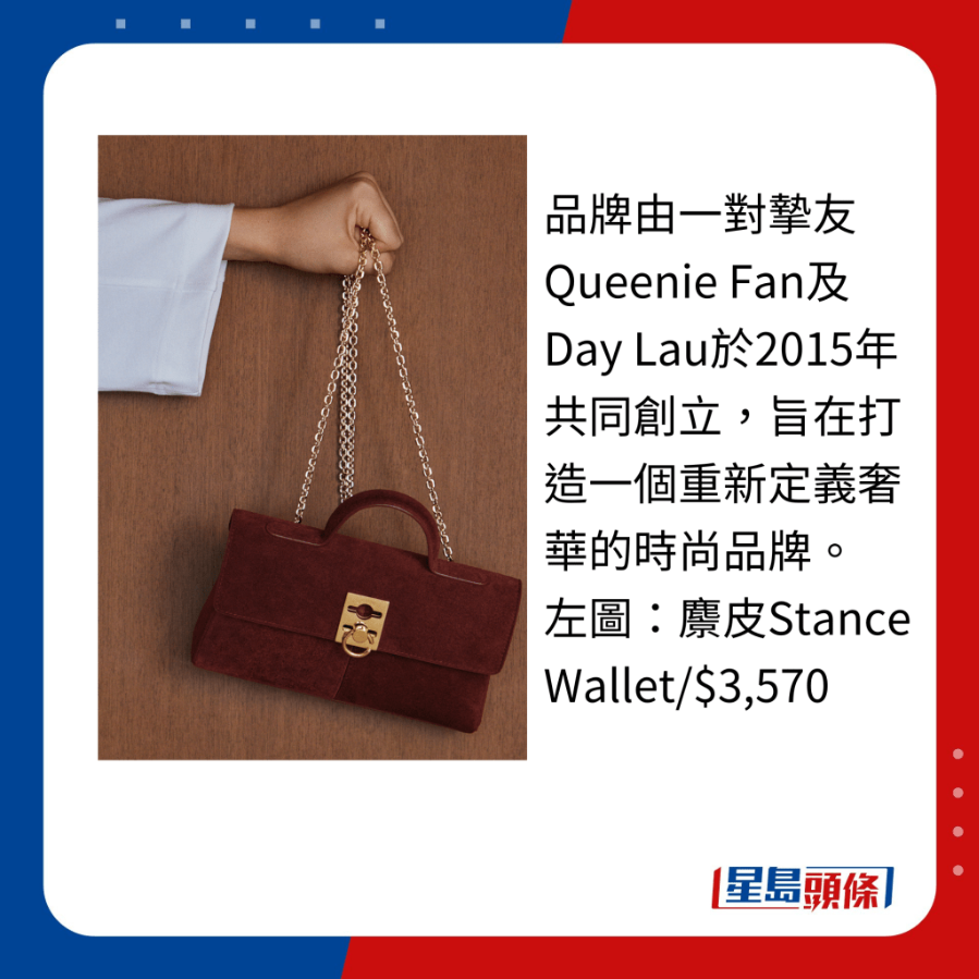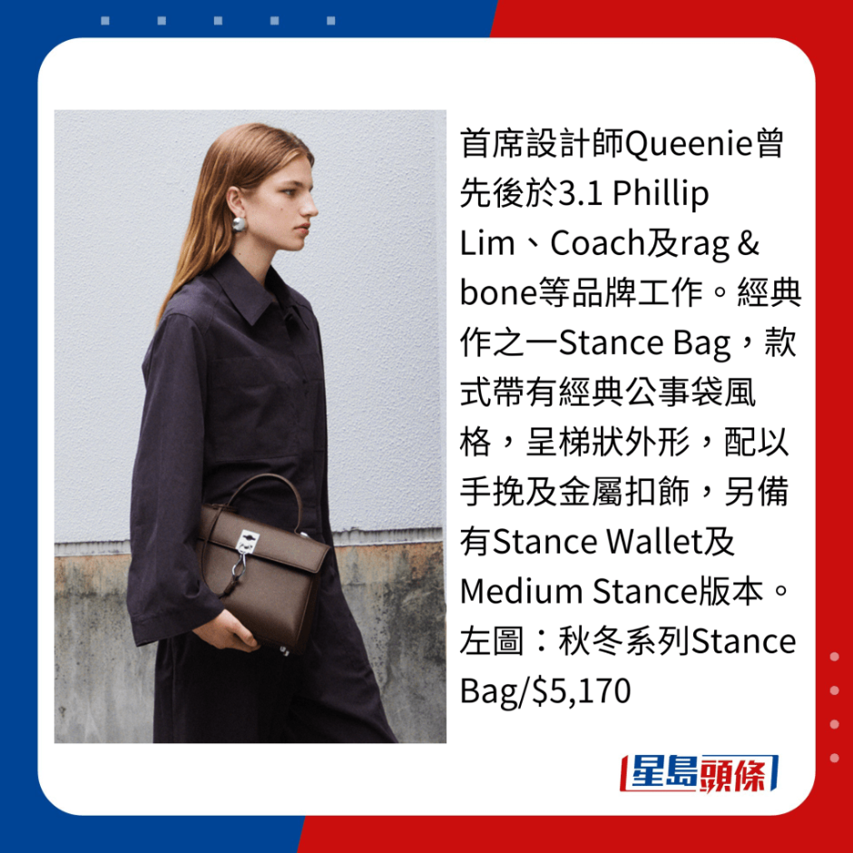 首席設(shè)計(jì)師Queenie曾先后于3.1 Phillip Lim、Coach及rag & bone等品牌工作。 經(jīng)典作之一Stance Bag,款式帶有經(jīng)典公事袋風(fēng)格,呈梯狀外形,配以手挽及金屬扣飾,另備有Stance Wallet及Medium Stance版本。