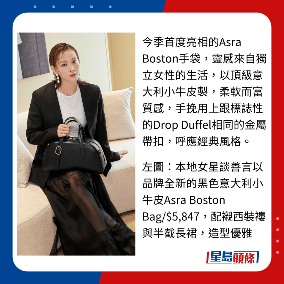 今季首度亮相的Asra Boston手袋,靈感來自獨(dú)立女性的生活,以頂級(jí)意大利小牛皮制,柔軟而富質(zhì)感,手挽用上跟標(biāo)志性的Drop Duffel相同的金屬帶扣,呼應(yīng)經(jīng)典風(fēng)格。