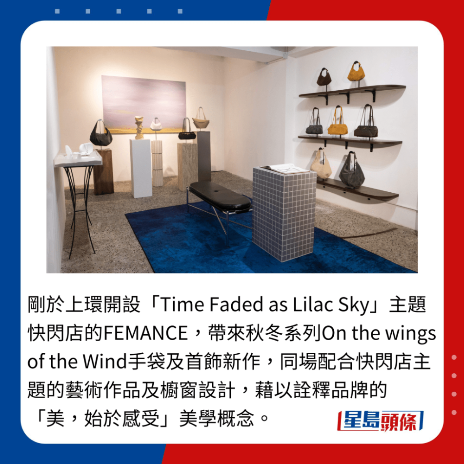 剛于上環(huán)開設(shè)“Time Faded as Lilac Sky”主題快閃店的FEMANCE,帶來秋冬系列On the wings of the Wind手袋及首飾新作,同場配合快閃店主題的藝術(shù)作品及櫥窗設(shè)計(jì),藉以詮釋品牌的“美,始于感受”美學(xué)概念。