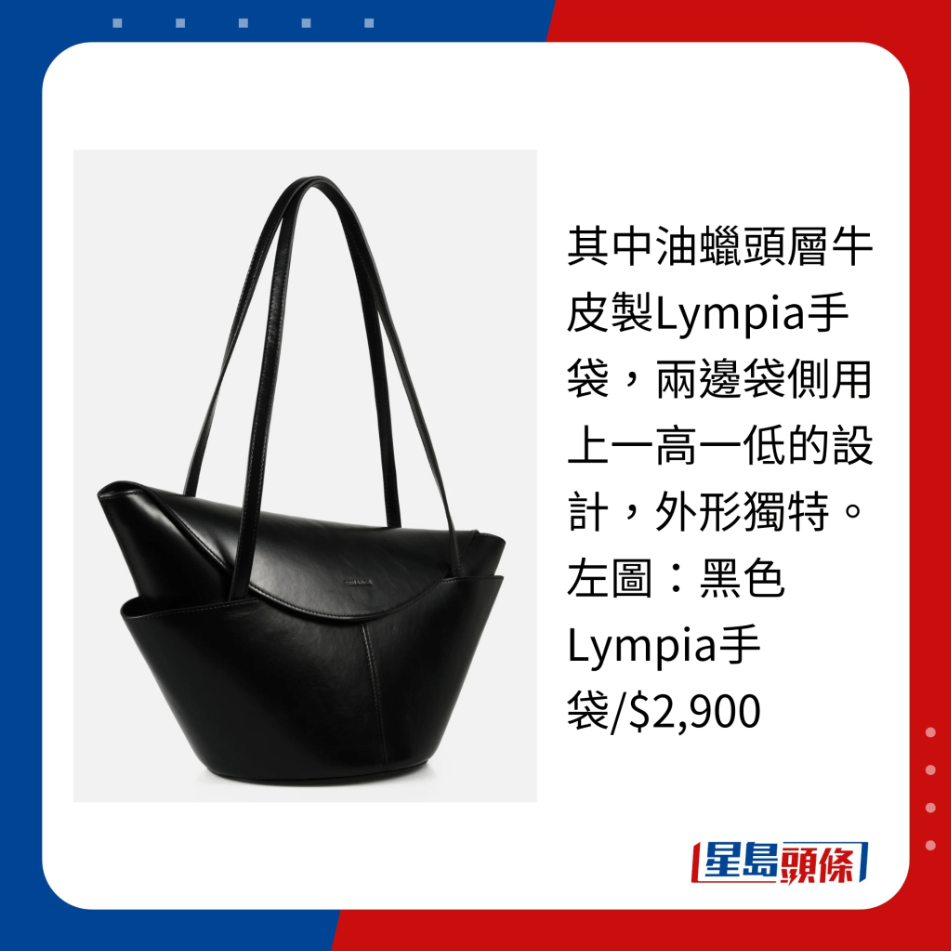 其中油蠟頭層牛皮制Lympia手袋,兩邊袋側(cè)用上一高一低的設(shè)計(jì),外形獨(dú)特。