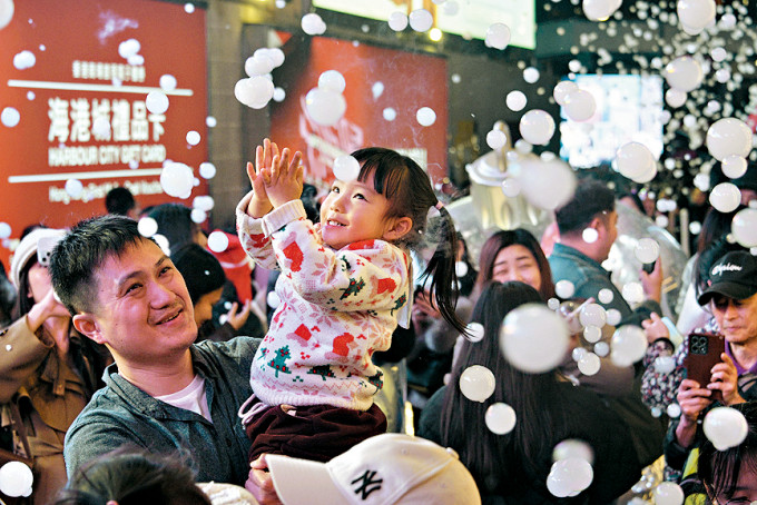 除了西九文化區(qū)外,尖沙咀昨晚也是人山人海,尤其是海運大廈戶外圣誕裝置發(fā)放煙火及增添“飄雪泡泡”效果,吸引不少市民和旅客駐足,并舉起手機拍照留念。
