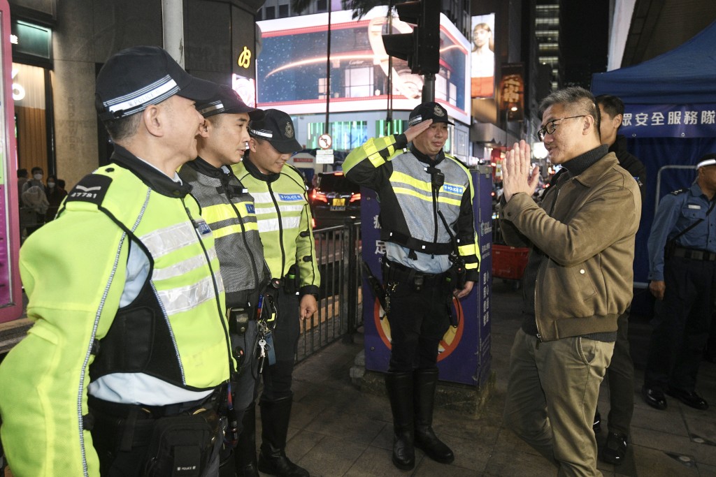 其中在蘭桂坊,蕭澤頤在港島總區(qū)指揮官郭嘉銓陪同下巡視,聽取在場(chǎng)警員及民安隊(duì)員們匯報(bào)工作,為同袍們,同時(shí)與少數(shù)族裔及家長小朋友等市民交流。他接受傳媒訪問時(shí),認(rèn)為警方目前管控秩序工作“暫時(shí)非常之好”,又提到人流點(diǎn)算系統(tǒng)正在運(yùn)作,控制室一直在觀察,有需要時(shí)會(huì)控制人流。