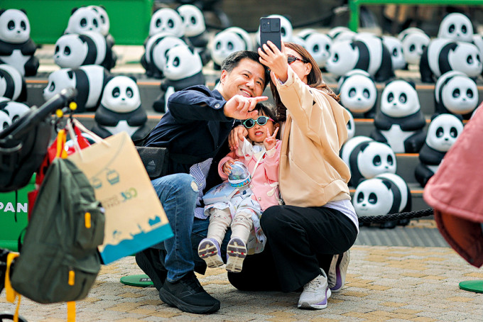 ▲不少內(nèi)地旅客根據(jù)小紅書的推薦,到昂坪市集游玩,并在熊貓雕塑前打卡。