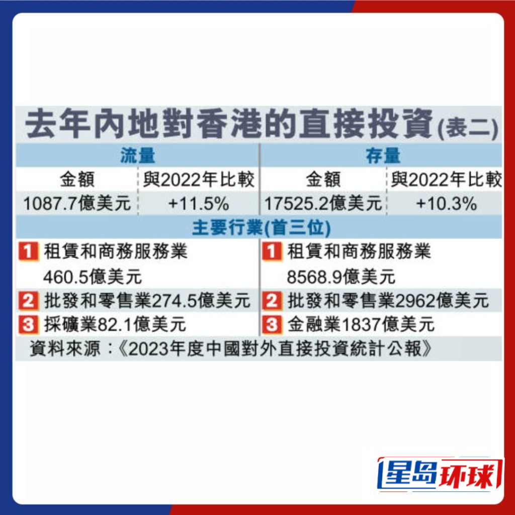 按中國(guó)商務(wù)部、國(guó)家統(tǒng)計(jì)局和外匯管理局發(fā)布的《2023年度中國(guó)對(duì)外直接投資統(tǒng)計(jì)公報(bào)》顯示,香港是內(nèi)地企業(yè)對(duì)外直接投資的主要目的地,去年投資流量達(dá)1087.7億美元,佔(zhàn)全部對(duì)外投資的61.4%,按年增長(zhǎng)11.5%;至去年底,內(nèi)地對(duì)港的直接投資總存量同比增10.3%,達(dá)1.75萬億美元,佔(zhàn)全部對(duì)外投資存量的59.3%。(見表二)