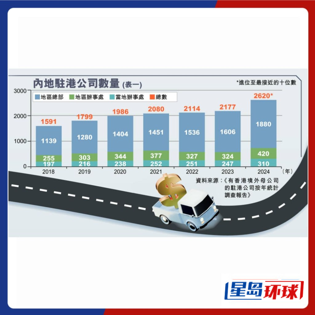 去年《施政報(bào)告》提出發(fā)展“總部經(jīng)濟(jì)”,按統(tǒng)計(jì)處《有香港境外母公司的駐港公司按年統(tǒng)計(jì)調(diào)查報(bào)告》,今年的境外母公司駐港公司總數(shù)增至新高的9960間,按年升近10%,其中2620間是內(nèi)地公司,比去年2177間增加20.4%。內(nèi)地駐港公司中,有310間為地區(qū)總部、420間為地區(qū)辦事處,以及1880間當(dāng)?shù)剞k事處,分別按年上升25.5%、29.6%及17.1%。(見表一)