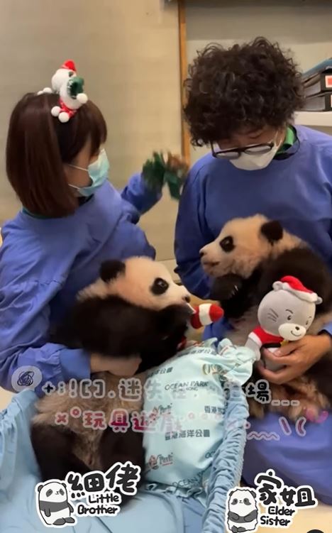 香港大熊貓官方專頁更新6只大熊貓生活短片,大曬大熊貓過圣誕節(jié)情況。兩只大熊貓龍鳳胎與其“奶爸”、“奶媽”護(hù)理員一起過節(jié),玩著圣誕玩具,氣氛十足。至于其余4只大熊貓,則獲海洋公園精心準(zhǔn)備“圣誕大餐”,包括由竹制成的圣誕樹,以及由大熊貓喜愛的紅蘿卜、紫薯及窩窩頭制成,上面寫有“Merry Christmas”冰盤。