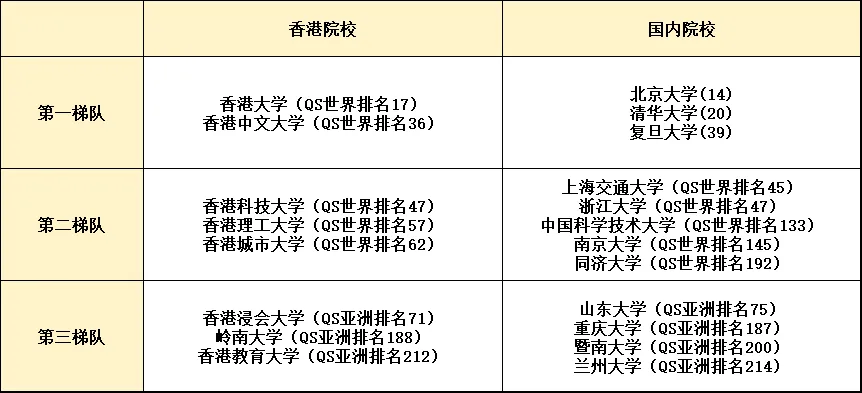 香港八大高校俗稱港八大,是由香港特別行政區(qū)“大學教育資助委員會”資助的八所公立大學,也是香港實力最強的八所重點大學,這八所分別為:香港大學、香港中文大學、香港科技大學、香港城市大學、香港理工大學、香港浸會大學、嶺南大學、香港教育大學。我們按照QS排名將港八大分為三梯隊,與內地高校作對比。