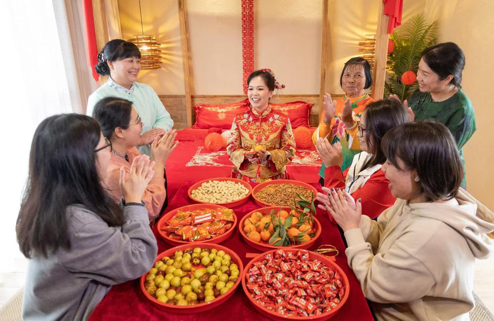“夾年生”是婚禮的準(zhǔn)備階段,包括選定合適的年份進(jìn)行婚禮籌備;“拿茶葉”環(huán)節(jié)通常涉及雙方家庭通過媒人交換茶葉等禮物,作為婚事的初步確認(rèn);“擇日”是根據(jù)雙方的生辰八字和家族傳統(tǒng),選擇一個(gè)吉利的日期進(jìn)行婚禮;“使日”是確定婚禮當(dāng)天及前后幾天的具體安排,包括各項(xiàng)禮儀和活動(dòng)的順序;“起廚”則是在婚禮當(dāng)天,開始準(zhǔn)備宴席,邀請(qǐng)親朋好友共聚一堂;“坐高堂”意為新娘和新郎在婚禮現(xiàn)場(chǎng)的高堂上接受親友的祝福;“上頭”是新娘和新郎在婚禮前進(jìn)行的一種傳統(tǒng)儀式,象征著他們即將步入婚姻的殿堂;“嫁儀”是新娘在出嫁前進(jìn)行的一系列儀式,包括梳頭、祭龍王、松頭等,同時(shí)會(huì)唱“嘆家姐”,這是沙田民歌最原始的曲調(diào);“花船迎親”是新娘乘坐裝飾華麗的花船,在親友的陪同下前往新郎家;“渡水飯”為新娘到達(dá)新郎家后,雙方家庭會(huì)在水上舉行一場(chǎng)盛宴,慶祝這一重要時(shí)刻;“拜堂”是新娘和新郎在堂屋內(nèi)向祖先和長(zhǎng)輩行禮,表示對(duì)他們的尊敬和感激;“鬧洞房”是婚禮結(jié)束后,親友們會(huì)在新房?jī)?nèi)舉行一系列的游戲和活動(dòng),以增添喜慶氣氛;“回門”是婚后第三天,新娘和新郎會(huì)一起回到新娘家,探望父母和親友。