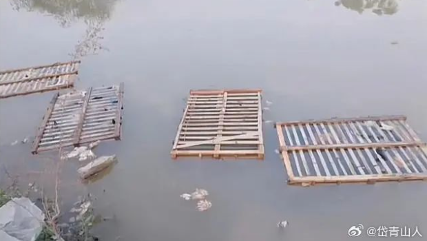 視頻所附的照片顯示,水塘中有好幾個(gè)竹籠浸在水里,籠子中隱約可見有黑色、白色的動物尸體。