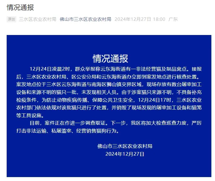佛山市三水區(qū)農(nóng)業(yè)農(nóng)村局今日就“近百只貓?jiān)谒帘荒缢馈币皇掳l(fā)布通報(bào),稱12月24日接獲群眾舉報(bào),云東海街道有一非法經(jīng)營貓及制品窩點(diǎn)。接報(bào)后,三水區(qū)農(nóng)業(yè)農(nóng)村局、區(qū)公安分局和云東海街道辦立即到案發(fā)地點(diǎn)進(jìn)行核查處置。案發(fā)地點(diǎn)位于三水區(qū)云東海街道與南海區(qū)獅山鎮(zhèn)交界區(qū)域,現(xiàn)場存放有數(shù)臺屠宰加工設(shè)備和來源不明的貓只一批,未發(fā)現(xiàn)相關(guān)人員。