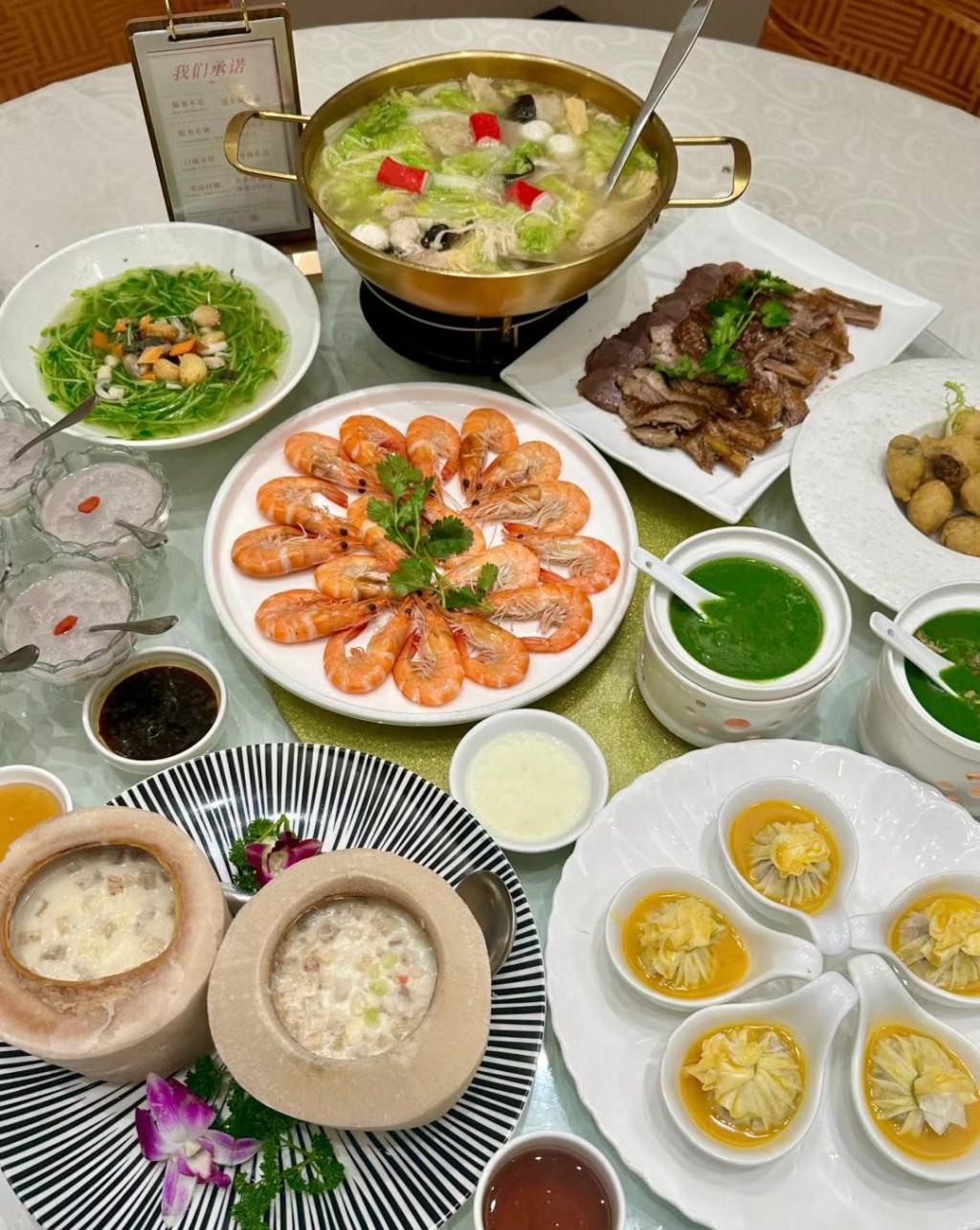 潮州美食發(fā)源于唐代,清末民初廚師張錦來根據(jù)韓愈詩作《初南食貽元十八協(xié)律》提及的食材,研發(fā)成韓公宴,可謂潮州版的滿漢全席,近年再由潮州學(xué)者與名廚完善菜式。 韓公宴包括十四道菜:赤龍臥茵、蒲魚戲水、白灼章舉、紅燒石蛤、蘆菔瑤柱、厚菇芥菜、雙丸浴海、小象拱冰、醬香時鮮、雜錦拼盤、酸甜蛇魚、香酥蠔煎、紅桃果點、翻砂香芋,另加八道佐料小菜。 韓府大院的韓公宴被中國烹飪協(xié)會評為金牌宴席,也上過央視,平時體驗價約¥2888十位,2024年做過一席網(wǎng)紅韓公宴豪華版¥8888。 其他地道潮州美食有潮式鹵水拼盤、特色生腌蝦、芥末爆南澳濕魷、醬油皇鵝腸、白果芋泥等。