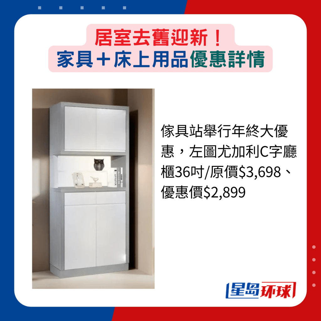 主售沙發(fā)及家居產品的梳化倉,包羅各款歐洲名牌、智能彈鉸、寵物布料沙發(fā),以及餐桌椅等。由即日至12月31日,只要選購正價產品滿$5,000即減$500,買滿$10,000即減$1,000。同樣舉行年終大優(yōu)惠的家居站,部分產品就低至半價,如灰木紋三門四桶衣柜36吋/原售$3,499,現(xiàn)以優(yōu)惠價$2,299發(fā)售,又或C字廳柜36吋/原售$3,698,現(xiàn)以$2,899便有交易。