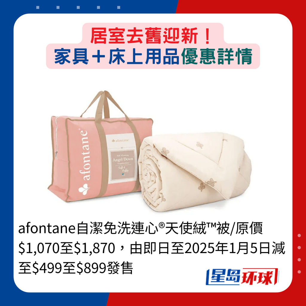 床褥、床單、被單及枕頭等床上用品,向來都是“送舊迎新”的熱選。主售床上用品的afontane雅芳婷,由即日至2025年1月5日,指定全棉卡通床品以接近半價發(fā)售,自潔免洗連心天使絨被更低于5折,原售$1,070至$1,870,減至$499至$899,切合季節(jié)保暖需要。