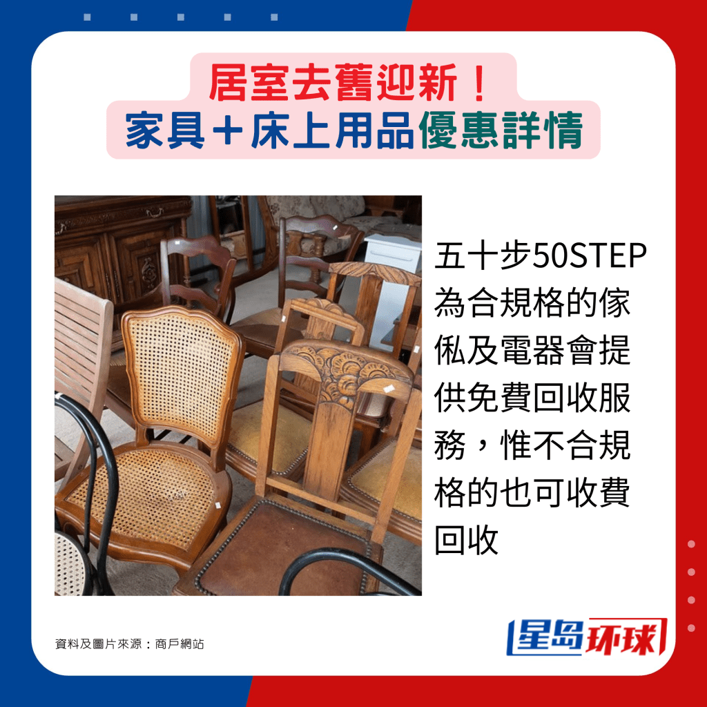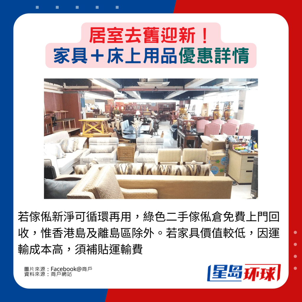 添置新家品的同時,也要處理舊家具,不一定要將之棄掉,相反可賦予它們第二生命。綠色二手家私倉提供免費上門回收服務,必須先將家具的照片及資料傳送到指定WhatsApp或電郵,確認合資格后才進行回收行動,他們會扣除基本營運開支,以低廉價錢再轉售家私。另一商戶五十步50STEP,同樣提供免費上門回收合規(guī)格家私和電器的服務, 并經維修翻新再出售,留意不合規(guī)格的物品則需要收費回收。
