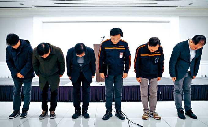 ▲濟州航空行政總裁金利培(右三)與一眾高層周日為空難鞠躬道歉。
