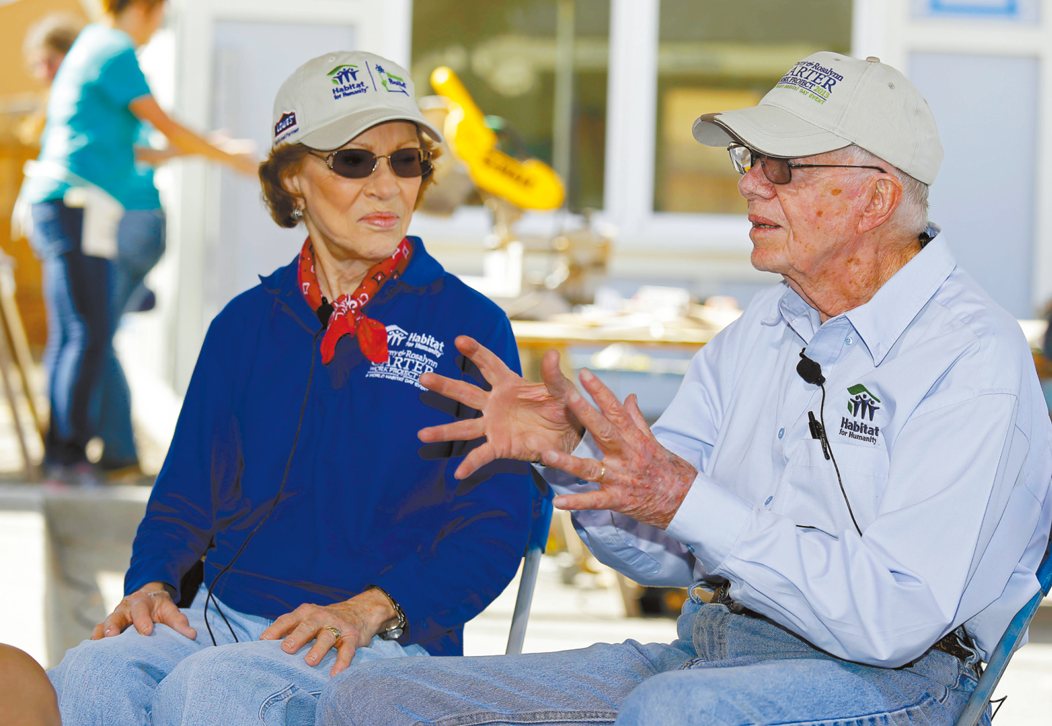 前總統(tǒng)卡特夫婦2013年10月7日到訪北加州屋侖“仁愛居所”(Habitat for Humanity)中心的建屋工地。美聯(lián)社資料圖片