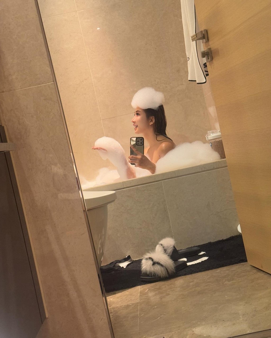 劉子儀日前與好友們?nèi)ス枮I冰雪大世界,雖然天氣極度寒冷,但她都大方分享一張?jiān)诒煅┑氐沫h(huán)境下,極低胸的靚相。其后她回到相對(duì)溫暖的香港后,急不及待貼出一張出浴自拍照,一手舉機(jī)拍攝,另一隻手就遮掩重要部位,極度噴血!事隔幾日,劉子儀再度分享浸泡泡浴的照片,今次她同樣全裸浸浴,雖然全個(gè)浴缸都是泡泡,但由于她身材極度夸張,加上誘惑的表情,同樣十分誘人。